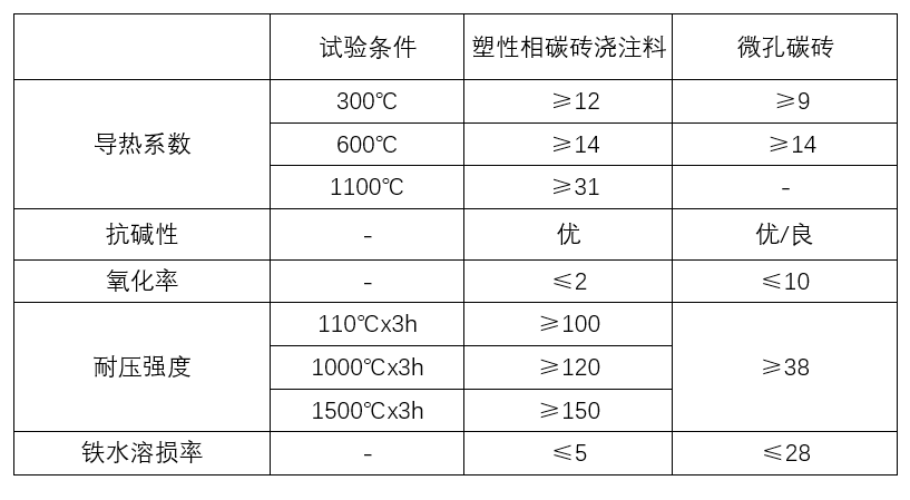 塑性相碳磚澆注料是高爐建造和大修領(lǐng)域的重大技術(shù)創(chuàng)新成果。此種材料具有導(dǎo)熱性強、高溫區(qū)無脆化、抗氧化性、抗堿性能優(yōu)良的特點,其耐壓強度遠(yuǎn)高于傳統(tǒng)碳磚。同時由于材料獨特的高溫塑性,能夠避免熱應(yīng)力破壞,在添加了TiC等組分后,其具有傳統(tǒng)產(chǎn)品無可比擬的長壽性能。
